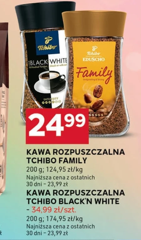 KAWA ROZPUSZCZALNA TCHIBO FAMILY 200 g; 124,95 zł/kg Najniższa cena z ostatnich 30 dni - 23,99 zł KAWA ROZPUSZCZALNA TCHIBO BLACK'N WHITE - 34,99 zł/szt. 200 g; 174,95 zł/kg Najniższa cena z ostatnich 30 dni - 23,99 zł