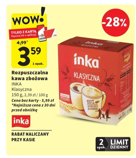 Rozpuszczalna kawa zbożowa INKA Klasyczna 150 g, 2,39 zł / 100 g Cena bez karty - 5,99 zł