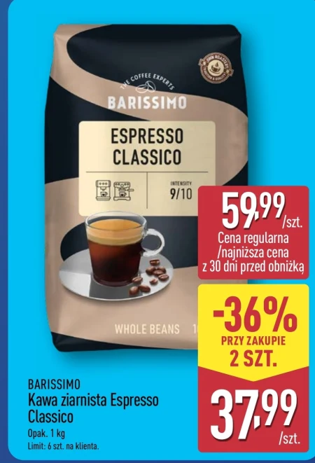 BARISSIMO Kawa ziarnista Espresso Classico Opak. 1 kg Limit: 6 szt. na klienta. Posmak Włoch w Twoim domu – Barissimo Espresso Classico, teraz w promocji w Aldi. Za opakowanie kilogramowe kawy ziarnistej zapłacisz tylko 37,99 zł za sztukę, kupując dwie. To idealna okazja, by zaopatrzyć się w aromatyczną kawę, która pobudzi zmysły i zapewni doskonały początek dnia, a Aldi gwarantuje jakość w przystępnej cenie. Pamiętaj, limit to 6 opakowań na klienta.