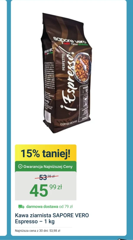 Darmowa dostawa od 79 zł Kawa ziarnista SAPORE VERO Espresso – 1 kg Najniższa cena z 30 dni: 53,98 zł