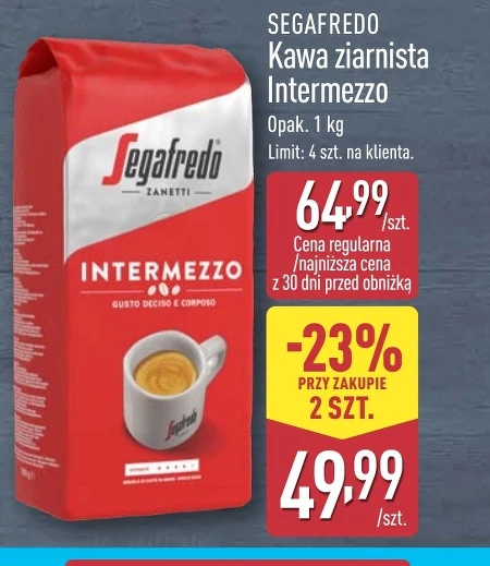 SEGAFREDO Kawa ziarnista Intermezzo Opak. 1 kg Limit: 4 szt. na klienta. Kawa ziarnista Segafredo Intermezzo to idealny wybór dla miłośników aromatycznego espresso, który można parzyć w ekspresie ciśnieniowym lub fusiarką. Dzięki starannie wyselekcjonowanym ziarniakom oraz intensywnemu smakowi, doskonale sprawdzi się jako pobudzający napój na początek dnia lub w trakcie przerwy w pracy.