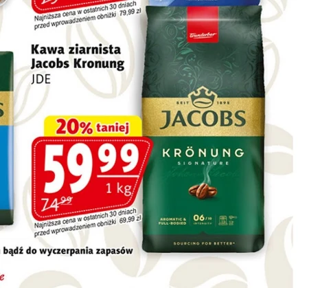 Kawa ziarnista Jacobs Kronung JDE Wyjątkowy aromat i bogaty smak **kawy Jacobs Kronung** sprawiają, że idealnie nadaje się do przygotowania porannego espresso lub klasycznej kawy przelewowej, zapewniając energetyczny start w dzień. Ten wysokiej jakości blend z **ziaren kawy arabica** to doskonały wybór dla miłośników **kawy ziarnistej**, ceniących intensywny, pełen smaku napar. Doskonała **kawa do ekspresu** i **kawa do kawiarek** pozwoli na przygotowanie ulubionego napoju w domowym zaciszu.
