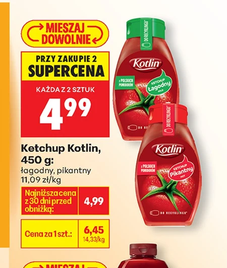 Ketchup Kotlin, 450 g; łagodny, pikantny 11,09 zł/kg PRZY ZAKUPIE 2 SUPERCENA KAŻDA Z 2 SZTUK 4,99 Najniższa cena z 30 dni przed obniżką: 6,45 Cena za 1 szt.: 4,99 14,33 zł/kg Ketchup Kotlin dostępny jest w Biedronce w dwóch wersjach – łagodnej i pikantnej. Przy zakupie dwóch słoików cena obniża się do 4,99 zł za sztukę, co stanowi atrakcyjną okazję. To idealny dodatek do ulubionych dań, takich jak frytki, mięsa czy kanapki, a także baza do przygotowania sosów. Aktualnie w Biedronce można go nabyć w promocyjnej cenie niższej niż 30 dni temu.