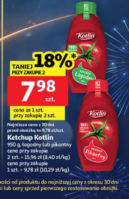 Ketchup Kotlin 950 g, łagodny lub pikantny cena przy zakupie 2 szt. - 15,96 zł (8,40 zł/kg) cena przy zakupie 1 szt. - 9,78 zł (10,29 zł/kg)