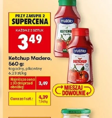 Ketchup Madero, o pojemności 560 g, jest dostępny w Biedronce w cenie 4,39 zł, co daje 7,84 zł za kilogram. Przy zakupie dwóch sztuk, każda kosztuje tylko 3,49 zł, niezależnie od wybranego smaku - łagodnego lub pikantnego. Ten klasyczny ketchup idealnie sprawdzi się jako dodatek do frytek, mięs, kanapek czy innych ulubionych potraw. Najniższa cena z ostatnich 30 dni przed obniżką wynosiła 3,49 zł, dlatego warto skorzystać z tej okazji i zaopatrzyć się w swój ulubiony ketchup w atrakcyjnej cenie. Oferta ważna od 2026-04-07 do 2026-04-11 Źródło: gazetka Biedronka