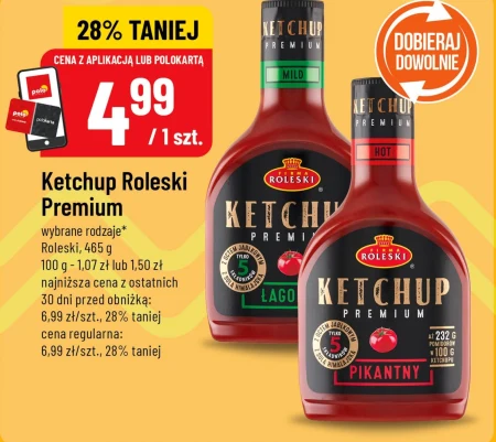 Ketchup Roleski Premium w Polo market można kupić już za 4,99 zł za opakowanie o wadze 465 g, co daje 1,07 zł za 100 g produktu. Aktualna promocja oferuje obniżkę aż o 28% w stosunku do ceny regularnej wynoszącej 6,99 zł. Ketchup dostępny jest w wybranych rodzajach i jego wyjątkowy smak sprawdzi się idealnie jako dodatek do wielu dań, od klasycznych frytek po ulubione burgery. Korzystając z aplikacji lub Pólkarty, możesz zaoszczędzić, kupując ten popularny ketchup w atrakcyjnej cenie.