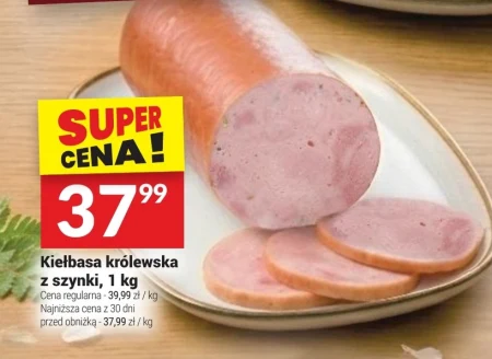 Kiełbasa królewska z szynki, waga 1 kg, dostępna jest w ofercie Twoj Market w cenie 37,99 zł. To doskonały wybór dla osób ceniących tradycyjny smak i wysoką jakość mięsa, idealna na śniadanie, obiad lub przekąskę. Regularna cena tego produktu to 39,99 zł za kilogram, a najniższa cena z ostatnich 30 dni wynosiła 37,99 zł za kilogram. Teraz możesz zaoszczędzić, wybierając tę wyśmienitą kiełbasę. Oferta ważna od 2026-04-15 do 2026-04-19 Źródło: gazetka Twoj Market