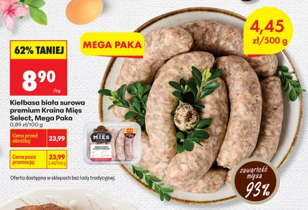 Kiełbasa biała surowa premium, Mega Paka, jest dostępna w ofercie Biedronka w cenie 8,90 zł za kilogram, co oznacza aż 62% taniej w porównaniu z ceną sprzed obniżki 23,99 zł. Produkt oferowany jest w ekonomicznej, dużej paczce. Idealnie nadaje się do przygotowania tradycyjnych polskich potraw, takich jak biała kiełbasa z żurkiem, pieczona na grillu lub jako dodatek do innych dań. Warto skorzystać z tej wyjątkowej okazji, aby zaopatrzyć się w wysokiej jakości kiełbasę w atrakcyjnej cenie, gdyż oferta dostępna jest wyłącznie w sklepach bez lady tradycyjnej.