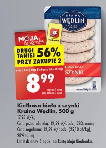 Kiełbasa biała z szynki Kraina Wędlin, 500 g 17,98 zł/kg Cena przed obniżką: 12,59 zł/opak., 28% mniej Cena regularna: 12,59 zł/opak. (25,18 zł/kg), 28% taniej Limit dzienny 6 opak. na kartę Moja Biedronka.