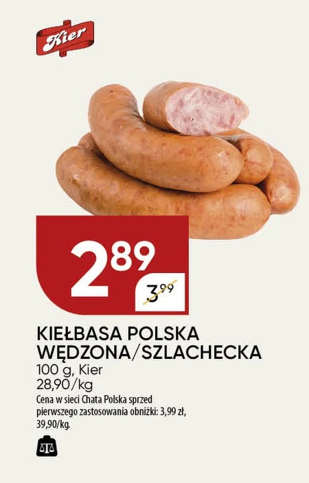 KIEŁBASA POLSKA WĘDZONA/SZLACHECKA 100 g, Kier 28,90/kg Cena w sieci Chata Polska sprzed pierwszego zastosowania obniżki: 3,99 zł, 39,90/kg.
