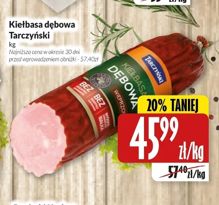 Kiełbasa dębowa Tarczyński kg Najniższa cena w okresie 30 dni przed wprowadzeniem obniżki - 57,40zł