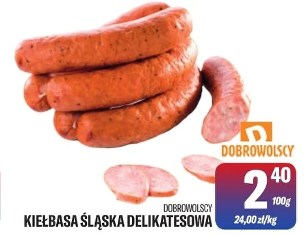 Kiełbasa śląska Delikatesowa Dobrowolscy w Tomi Markt kosztuje teraz 2,40 zł za 100g, co daje cenę 24,00 zł/kg. To tradycyjny produkt mięsny idealny na zimną płytę lub do kanapek. Aktualnie w Tomi Markt możesz zaoszczędzić kupując tę kiełbasę w promocji. Gramatura produktu to 40g.