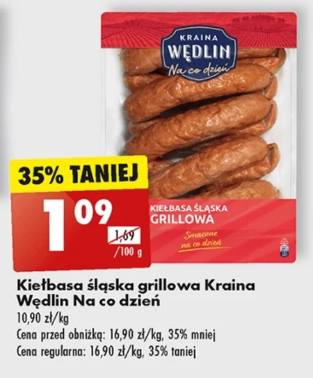 Kiełbasa śląska grillowa Kraina Wędlin Na co dzień 10,90 zł/kg Cena przed obniżką: 16,90 zł/kg, 35% mniej Cena regularna: 16,90 zł/kg, 35% taniej