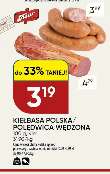 Kiełbasa Polska, Połędwica Wędzona jest dostępna w sieci sklepów Chata Polska w cenie 31,90 zł za kilogram, w opakowaniach po 100 gramów. To tradycyjnie wędzony, delikatny produkt mięsny, idealny na zimną kolację lub jako dodatek do kanapek. W Chacie Polskiej ta kiełbasa była wcześniej sprzedawana w cenie 3,99-4,79 zł, co daje 39,90-47,90 zł za kilogram – warto skorzystać z aktualnej oferty i cieszyć się smakiem prawdziwej, polskiej kiełbasy.