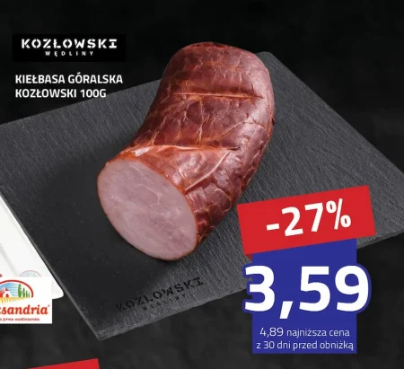 KIEŁBASA GÓRALSKA KOZŁOWSKI 100G Kiełbasa góralska Kozłowski to tradycyjny wyrób wędliniarski o intensywnym, wędzonym smaku, który doskonale sprawdzi się jako dodatek do deski wędlin lub kanapek. Aromatyczna kiełbasa z nutą przypraw idealnie nadaje się do smażenia, grillowania oraz jako składnik bigosu, żurku czy innych tradycyjnych polskich potraw.