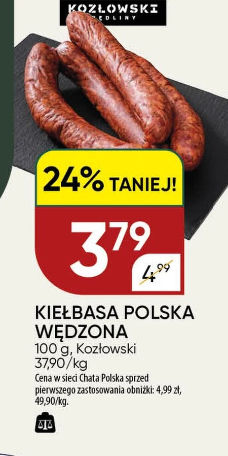 KIEŁBASA POLSKA WĘDZONA 100 g, Kozłowski 24% TANIEJ! 3,79 zł Cena w sieci Chata Polska sprzed pierwszego zastosowania obniżki: 4,99 zł. 37,90/kg Kiełbasa Polska Wędzona Kozłowski to klasyczny smak, teraz dostępny w obniżonej cenie w sklepach Chata Polska. Idealna na zimną płytę, do kanapek, czy jako dodatek do dań gotowych. Wykonana z wysokiej jakości składników, z pewnością zadowoli miłośników tradycyjnych wędlin. Aktualnie w atrakcyjnej promocji.