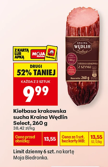 Kiełbasa krakowska sucha Kraina Wędlin Select, 260 g 38,42 zł/kg Limit dzienny 6 szt. na kartę Moja Biedronka.