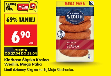 Kiełbasa Śląska Kraina Wędlin, Mega Paka jest dostępna w ofercie Biedronka w cenie 6,90 zł za kilogram, z 69% niższą ceną przy zakupie z kartą Moja Biedronka lub za pośrednictwem aplikacji. Ten produkt to klasyczna, śląska kiełbasa, idealna na grilla, do kanapek lub jako dodatek do dań obiadowych. Oferta jest ważna od 27 do 28 kwietnia, z limitem dziennym 3 kilogramów na jedną kartę. Warto wykorzystać tę okazję, aby zaopatrzyć się w ulubioną kiełbasę w bardzo atrakcyjnej cenie. Źródło: gazetka Biedronka