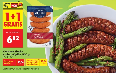 Kiełbasa Śląska Kraina Wędlin dostępna jest w ofercie Biedronka w cenie 12,40 zł za kilogram, pakowana w zestawy po 550 g. Obecnie można ją nabyć w promocji 1+1 gratis, co oznacza, że każda z dwóch sztuk kosztuje 6,82 zł. To idealna propozycja na śniadanie, obiad lub grilla, sprawdzi się w wielu daniach. Warto skorzystać z tej wyjątkowej okazji, ponieważ limit dzienny na kartę Moja Biedronka to 4 sztuki. Źródło: gazetka Biedronka