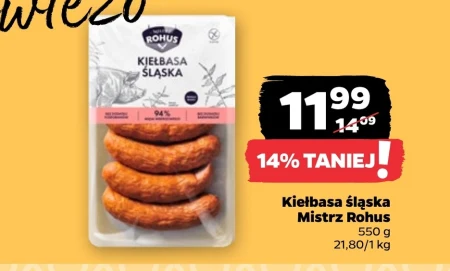 Kiełbasa śląska Mistrz Rohus dostępna jest w ofercie Netto w cenie 11,99 za 550 g, co daje 21,80 za kilogram. Obecnie jest 14% taniej niż poprzednio, zamiast 14,09. To tradycyjna, wysokiej jakości kiełbasa, idealna na śniadanie, obiad lub kolację. Sprawdzi się zarówno na zimno, jako przekąska, jak i po obróbce termicznej, np. z ziemniakami i surówką. Źródło: gazetka Netto