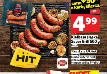 Kiełbasa śląska Super Grill od Pekpol dostępna jest w Topaz w cenie 4,99 zł za sztukę, co daje 9,98 zł za kilogram. To tradycyjny, wysokiej jakości produkt idealny na grilla, obiad lub jako dodatek do kanapek. Doskonale sprawdzi się podczas rodzinnego spotkania czy pikniku, oferując wyrazisty, wędzony smak. Skorzystaj z tej okazji, aby zaopatrzyć się w sprawdzoną kiełbasę w atrakcyjnej cenie, obniżonej z 9,99 zł. Oferta ważna od 2026-04-16 do 2026-04-22 Źródło: gazetka Topaz