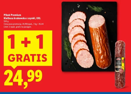 Pikok Premium Kiełbasa krakowska z szynki, XXL 550 g Cena poza promocją: 24,99/opak., 1 kg = 45,44 Limit: 2 opak. gratis na paragon.