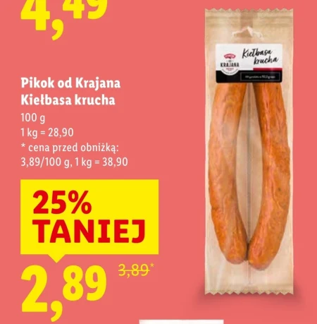 Pikok od Krajana Kiełbasa krucha 100 g 1 kg = 28,90 * cena przed obniżką: 3,89/100 g, 1 kg = 38,90 Krucha kiełbasa doskonale sprawdzi się jako wyrazisty dodatek do kanapek, na deskę wędlin oraz do tradycyjnych dań kuchni polskiej, takich jak bigos, kapuśniak czy jajecznica na śniadanie. Dzięki intensywnemu smakowi i aromatycznym przyprawom będzie idealna do grillowania, smażenia oraz jako szybka przekąska na ciepło i na zimno.