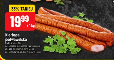 Kiełbasa podwawelska Madej Wróbel, 1 kg cena sprzed pierwszego zastosowania obniżki: 29,99 zł/kg, 33% taniej cena regularna: 29,99 zł/kg, 33% taniej