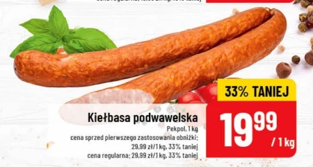 Kiełbasa podwawelska Pekpol, 1 kg cena sprzed pierwszego zastosowania obniżki: 29,99 zł/1 kg, 33% taniej cena regularna: 29,99 zł/1 kg, 33% taniej