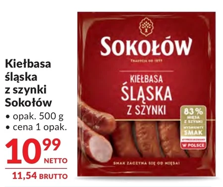 Kiełbasa śląska z szynki Sokołów dostępna jest w ofercie Makro Cash&Carry w cenie 10,99 zł za opakowanie 500 g. Wykonana z wysokiej jakości mięsa z szynki, o zawartości 83%, charakteryzuje się wyśmienitym smakiem i tradycyjną recepturą Sokołowa, sięgającą 1953 roku. Doskonale sprawdzi się jako dodatek do kanapek, składnik dań obiadowych lub przekąska. To idealna okazja, aby zaopatrzyć się w sprawdzoną jakość w atrakcyjnej cenie. Oferta ważna od 2026-04-14 do 2026-04-27 Źródło: gazetka Makro Cash&Carry