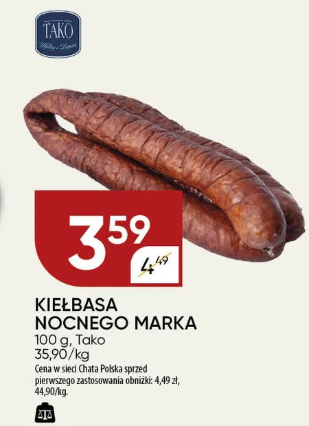 KIEŁBASA NOCNEGO MARKA 100 g, Tako 35,90/kg Cena w sieci Chata Polska sprzed pierwszego zastosowania obniżki: 4,49 zł, 44,90/kg.