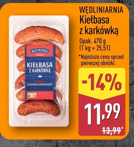 Kiełbasa z karkówką dostępna w Aldi w cenie 11,99 za opakowanie 470 g, co daje 25,51 za kilogram. Aktualnie produkt objęty jest promocją z 14% rabatem, obniżoną z ceny 13,99. Doskonale sprawdzi się na śniadanie, do kanapek lub jako dodatek do obiadu. To idealna propozycja dla miłośników tradycyjnych smaków, którzy poszukują dobrej jakości wędliny w atrakcyjnej cenie. Źródło: gazetka Aldi