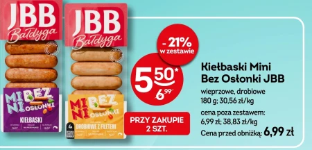 Kiełbaski Mini Bez Ostońki JBB wieprzowe, drobiowe 180 g: 30,56 zł/kg cena poza zestawem: 6,99 zł; 38,83 zł/kg Cena przed obniżką: 6,99 zł
