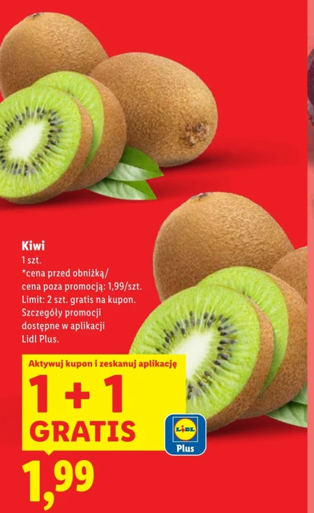 Kiwi 1 szt. *cena przed obniżką/ cena poza promocją: 1,99/szt. Limit: 2 szt. gratis na kupon. Szczegóły promocji dostępne w aplikacji Lidl Plus.