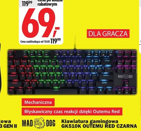 Klawiatura gamingowa MAD DOG GK510K OUTEMU RED czarna dostępna jest w ofercie Media Expert w cenie 69,99 zł po zastosowaniu kodu rabatowego, zamiast ceny regularnej 119,99 zł. Promocja obowiązuje od 10 maja. To mechaniczna klawiatura stworzona z myślą o graczach, zapewniająca błyskawiczny czas reakcji dzięki zastosowaniu przełączników Outemu Red. Produkt przeznaczony jest do komfortowej gry, oferując precyzję i szybkość akcji, niezbędną podczas dynamicznej rozgrywki. Warto skorzystać z tej okazji i poprawić swoje gamingowe doświadczenie. Źródło: gazetka Media Expert