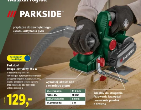 Parkside® Strug elektryczny, 750 W w zestawie: ogranicznik równoległy, ogranicznik głębokości strugania wręgów, klucz szczękowy, klucz z gniazdem sześciokątnym oraz złączka do zewnętrznego układu zasysania