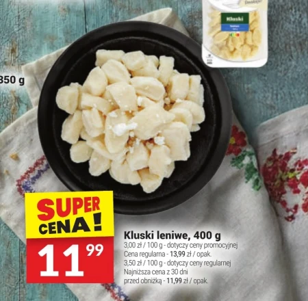 Kluski leniwe, 400 g 3,00 zł / 100 g - dotyczy ceny promocyjnej Cena regularna - 13,99 zł / opak. 3,50 zł / 100 g - dotyczy ceny regularnej Najniższa cena z 30 dni przed obniżką - 11,99 zł / opak.