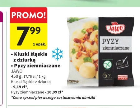 Kluskie śląskie z dziurką JAWO dostępne są teraz w Intermarche w cenie 7,99 zł za opakowanie 450 g, co daje 17,76 zł za kilogram. To tradycyjne, śląskie kluski z charakterystycznym wgłębieniem, idealne jako dodatek do mięs, sosów czy zasmażki. W tej samej gazetce Intermarche pyzy ziemniaczane oferowane są za 10,99 zł, jednak aktualnie kluskie śląskie są bardziej opłacalne dzięki obniżce z ceny 9,19 zł. Zachęcamy do zakupu, bo taka cena na kluski śląskie z dziurką to rzadka okazja.