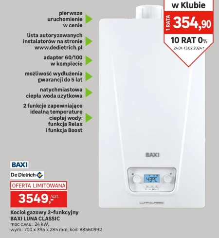 Kocioł gazowy 2-funkcyjny BAXI LUNA CLASSIC moc c.w.u.: 24 kW, wym.: 700 x 395 x 285 mm, kod: 88560992