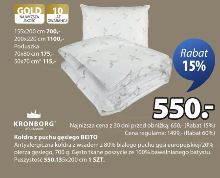 Kołdra z puchu gęsiego BEITO Antyalergiczna kołdra z wsadem z 80% białego puchu gęsi europejskiej/20% pierza gęsiego, 700 g. Gęsto tkane poszycie ze 100% bawełnianego batystu. Puszystość 550.135x200 cm 1 SZT.