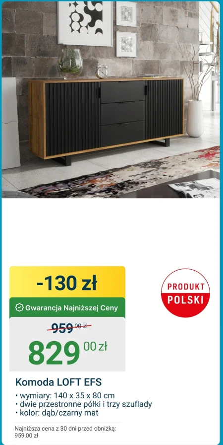 Komoda LOFT EFS · wymiary: 140 x 35 x 80 cm · dwie przestronne półki i trzy szuflady · kolor: dąb/czarny mat Najniższa cena z 30 dni przed obniżką: 959,00 zł