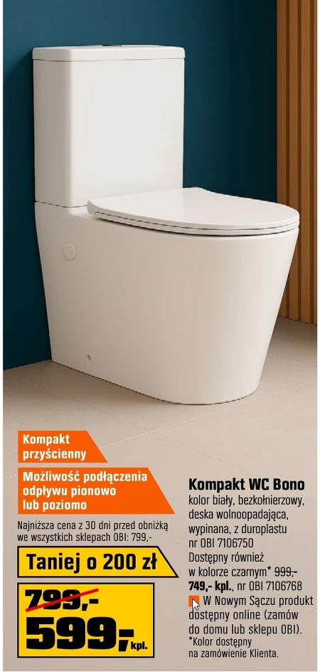 Kompakt WC Bono kolor biały, bezkołnierzowy, deska wolnoopadająca, wypinana, z duroplastu
