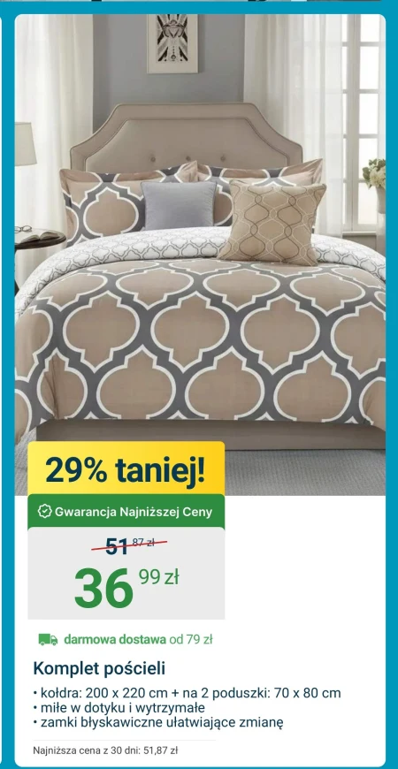 Komplet pościeli • kołdra: 200 x 220 cm + na 2 poduszki: 70 x 80 cm • miłe w dotyku i wytrzymałe • zamki błyskawiczne ułatwiające zmianę Najniższa cena z 30 dni: 51,87 zł