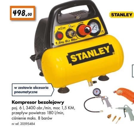 Kompresor bezolejowy poj. 6 l, 3400 obr./min, moc 1,5 KM, przepływ powietrza 180 l/min, ciśnienie maks. 8 barów nr ref. 20595484