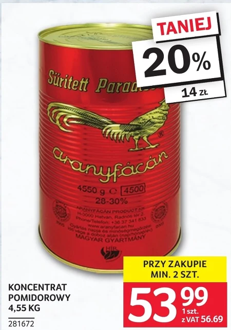 Koncentrat pomidorowy o wadze 4,55 kg dostępny jest w ofercie Selgros Cash&Carry w cenie 53,99 zł za sztukę (56,69 zł z VAT) przy zakupie minimum dwóch sztuk. Produkt ten stanowi bazę do przygotowania wielu dań – sosów, zup, gulaszy, a także jako dodatek do mięs i warzyw. Jest to wydajny sposób na dodanie smaku i aromatu pomidorów do potraw. Warto rozważyć zakup większej ilości, aby mieć zapas na dłużej i cieszyć się intensywnym smakiem pomidorów przez cały rok. Oferta ważna od 2026-04-09 do 2026-04-22 Źródło: gazetka Selgros Cash&Carry