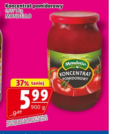 Koncentrat pomidorowy Mondello dostępny jest w ofercie Prim Market w cenie 6,66 zł za kilogram, a opakowanie 900 g jest teraz 37% taniej, kosztując jedynie 5,99 zł zamiast 9,49 zł. To wydajny sposób na przygotowanie smakowitych sosów, zup i potraw jednogarnkowych, dodając intensywny, pomidorowy aromat. Najniższa cena tego produktu w ostatnich 30 dniach przed obniżką wynosiła 9,49 zł, więc warto skorzystać z tej wyjątkowej okazji.