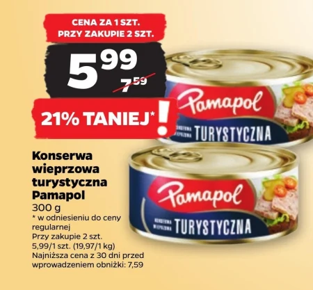 Konserwa wieprzowa turystyczna Pamapol 300 g * w odniesieniu do ceny regularnej Przy zakupie 2 szt. 5,99/1 szt. (19,97/1 kg) Najniższa cena z 30 dni przed wprowadzeniem obniżki: 7,59