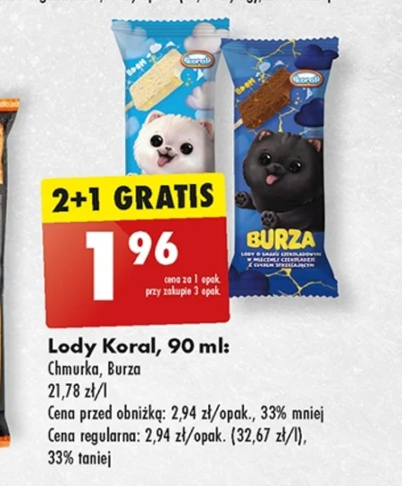 Lody Koral, 90 ml: Chmurka, Burza 21,78 zł/l Cena przed obniżką: 2,94 zł/opak., 33% mniej Cena regularna: 2,94 zł/opak. (32,67 zł/l), 33% taniej