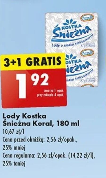 Lody Kostka Śnieżna Koral, 180 ml 10,67 zł/l Cena przed obniżką: 2,56 zł/opak., 25% mniej Cena regularna: 2,56 zł/opak. (14,22 zł/l), 25% taniej