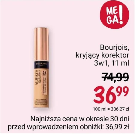 Bourjois, kryjący korektor 3w1, 11 ml. Najniższa cena w okresie 30 dni przed wprowadzeniem obniżki: 36,99 zł.